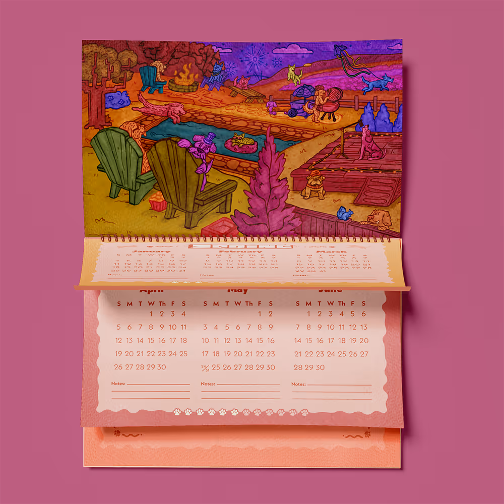 Dogs Through the Seasons is a playful, four-part calendar that imagines a world run entirely by dogs, celebrating their adventures across spring, summer, fall, and winter. Designed as a three-month rotating calendar, the piece brings humor and warmth to each season through a series of vibrant digital illustrations. The artwork blends the charm of vintage comic styles with bold, saturated colors to create a lively, cohesive visual narrative. Together, the seasonal scenes offer dog lovers a joyful companion throughout the year, turning everyday scheduling into a moment of delight.