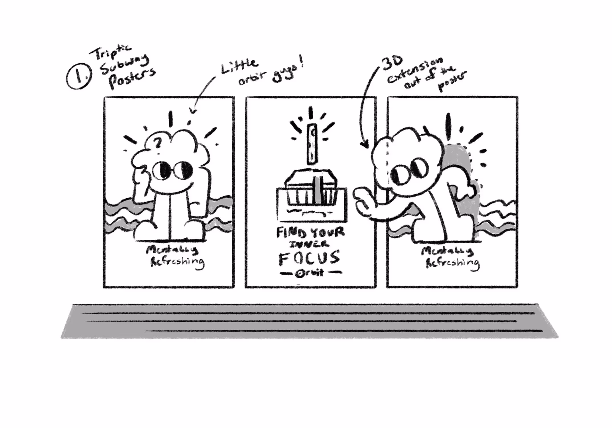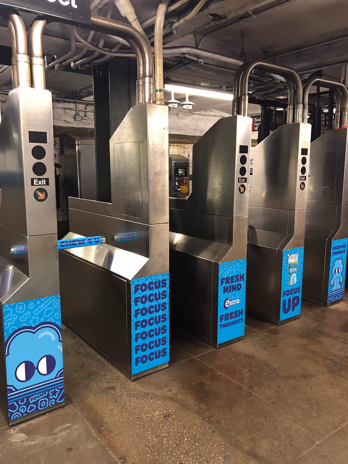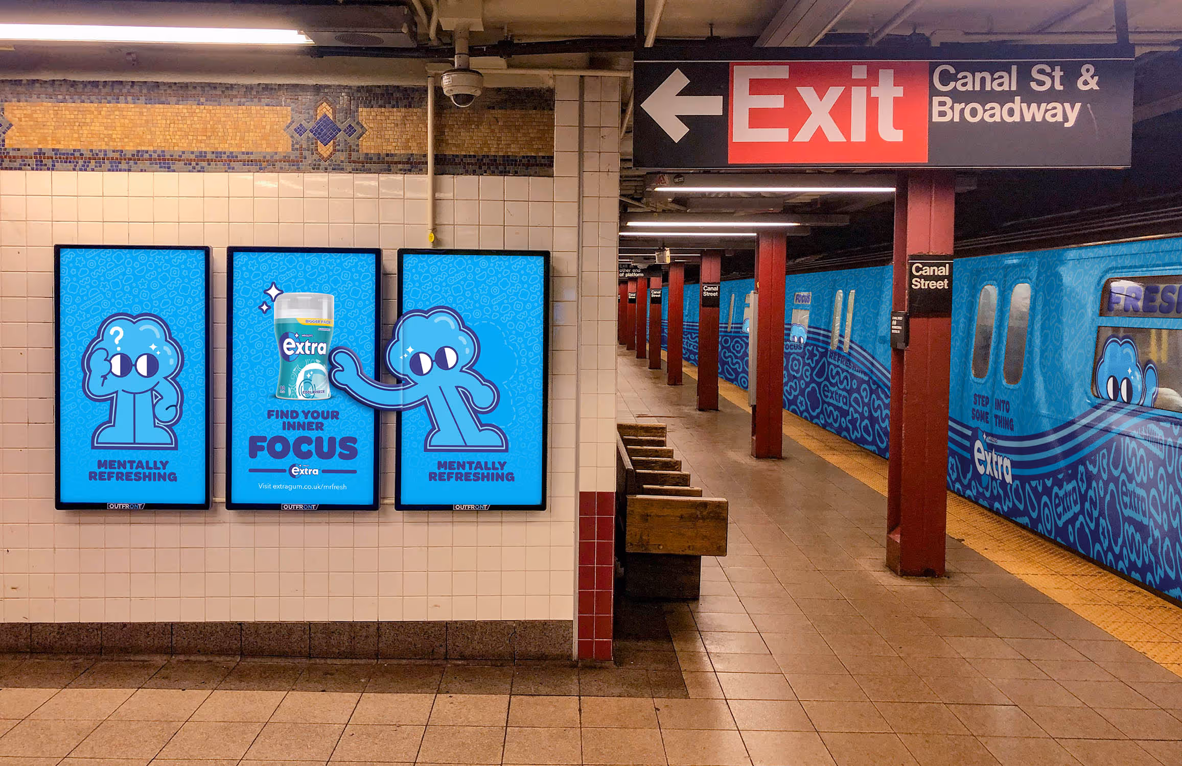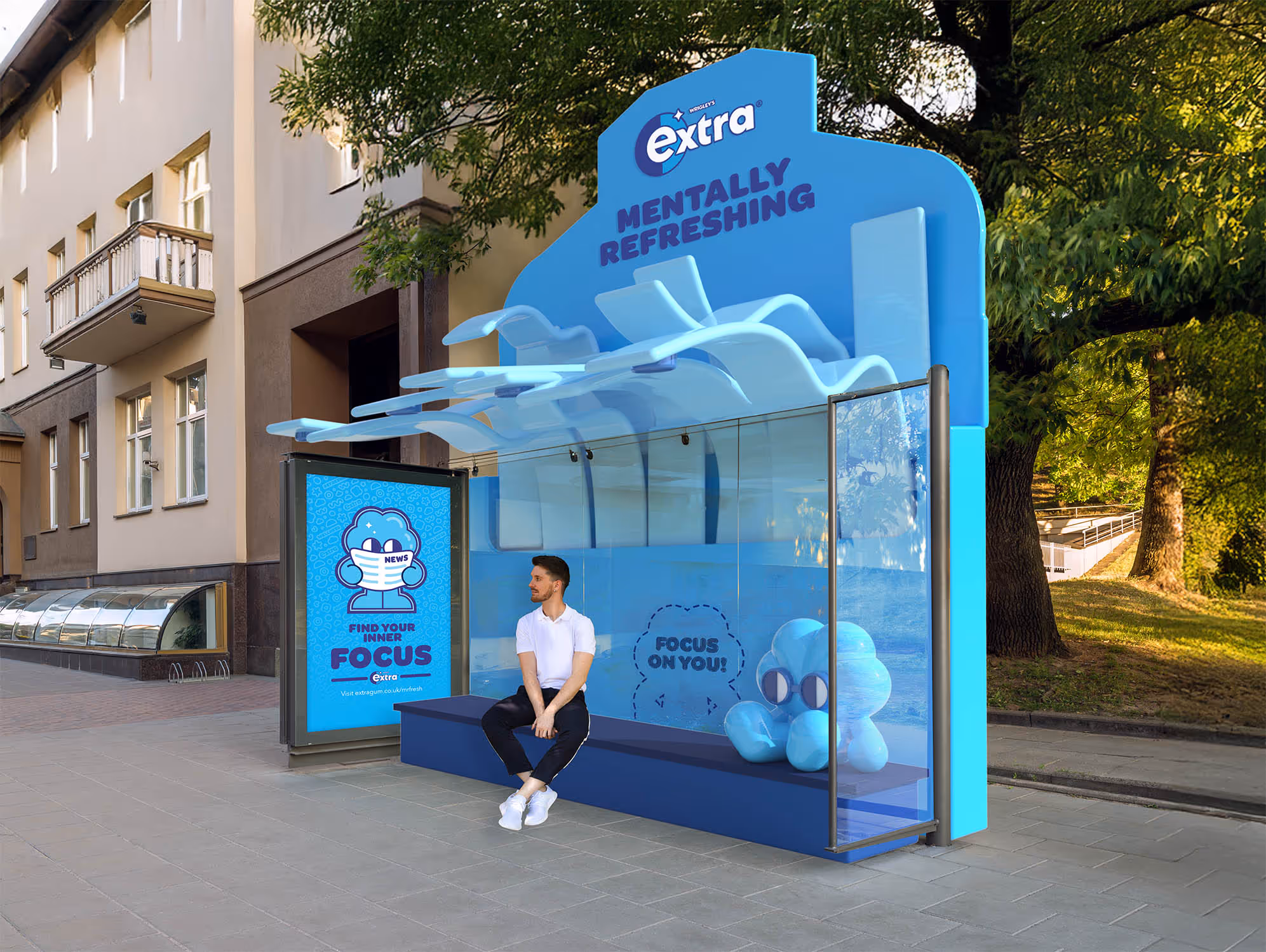 The “Focus on You” campaign for Extra Gum is an out-of-home advertising concept designed to promote mental clarity and emotional well-being for Gen Z audiences. Centered around transit advertising and immersive experiences, the campaign transforms subway stations, bus stops, and direct mail into moments of calm within chaotic city life. Bold typography and Extra’s signature blue color create a consistent visual identity, while playful gum-brain mascots encourage interaction and shareable moments across social media.