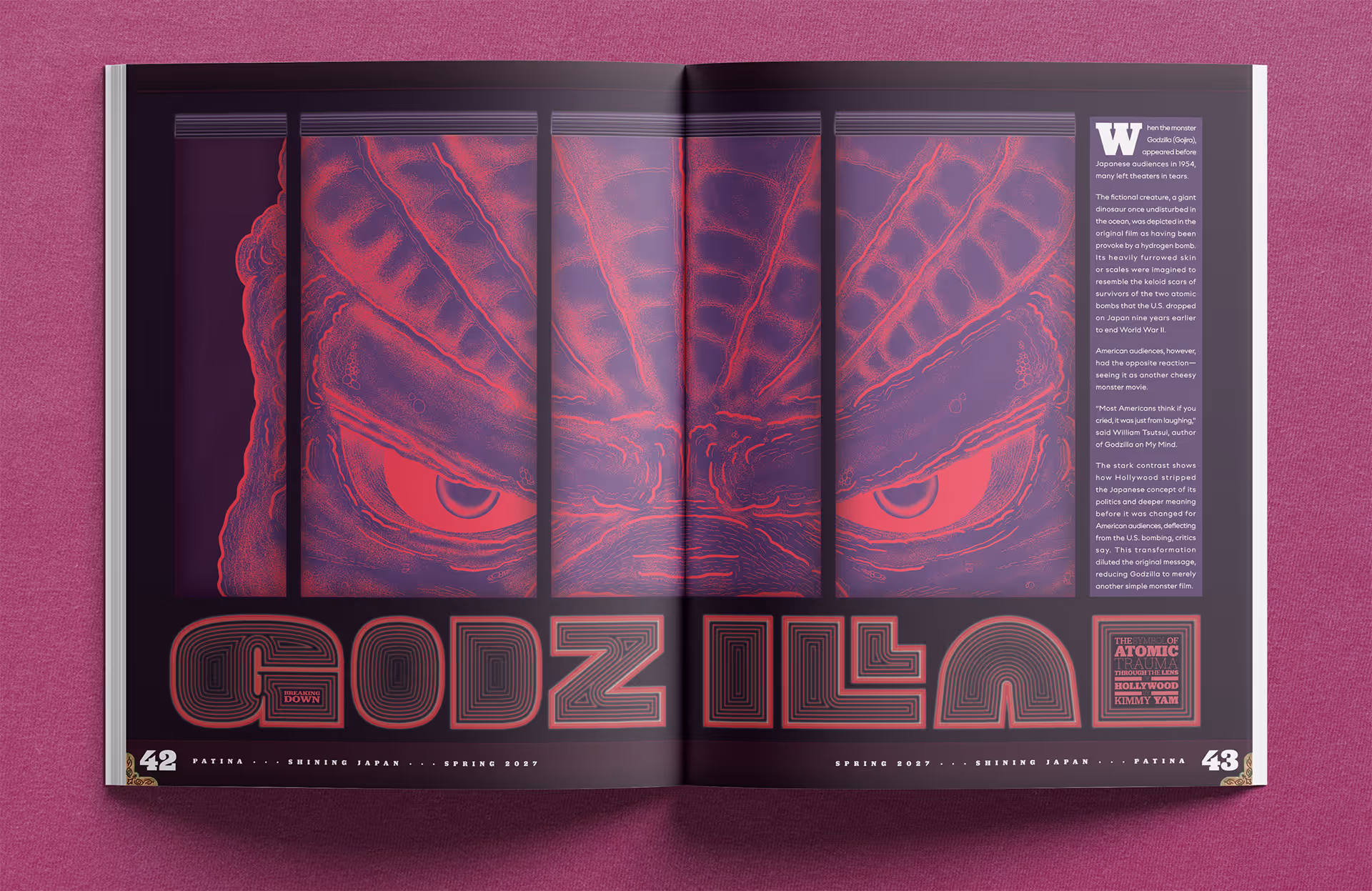 PATINA is a culture magazine exploring the exchange of traditions and aesthetics between nations, with the Shining Japan issue highlighting how American subcultures evolve abroad. The issue’s main features focus on Japan’s adoption of rockabilly and the reimagining of Godzilla, tracing how global influences are reshaped over time. The visual system combines bold purples and reds with contrasting lime greens and yellows, reflecting the energy and cultural fusion at the heart of each story. Custom illustrations, experimental typography, and varied headline treatments give the layouts a vibrant, editorial edge that mirrors cultural diversity. Every spread was designed from the ground up, creating a cohesive yet eclectic reading experience that celebrates cultural reinvention.