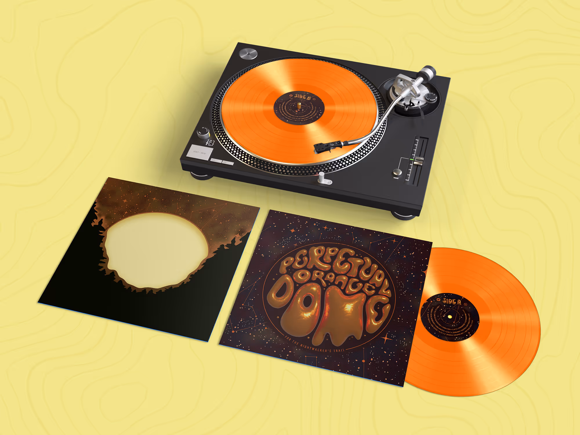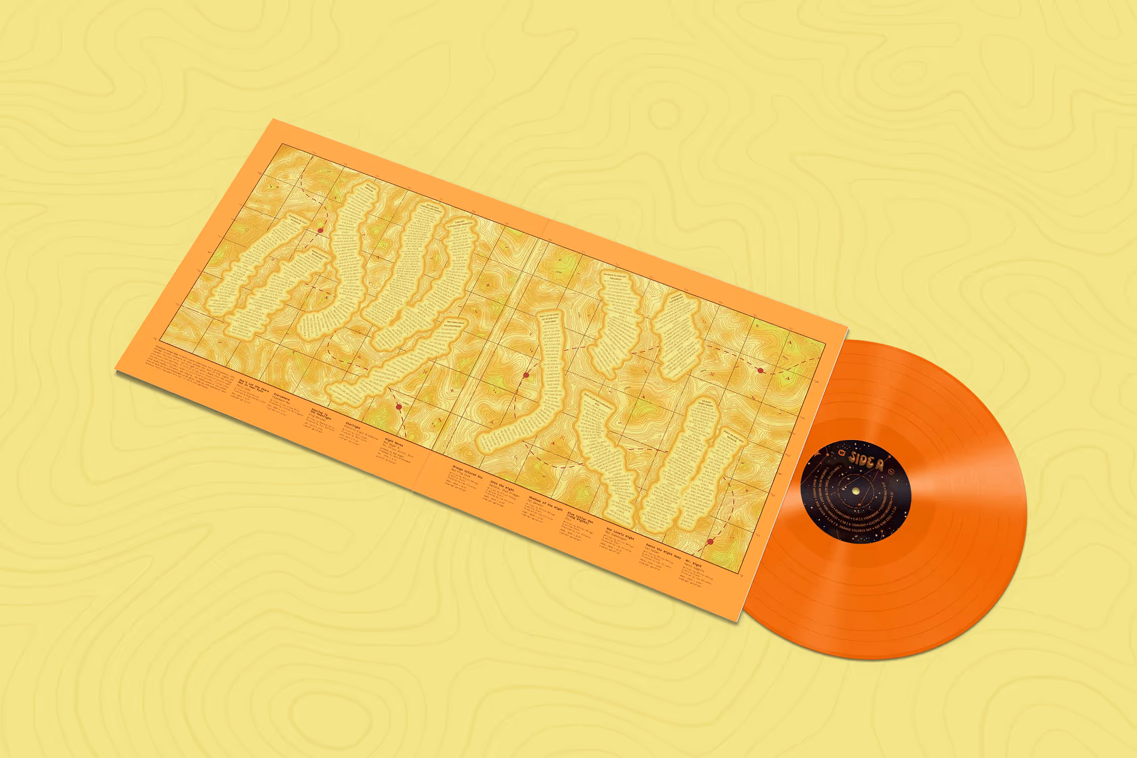 Perpetual Orange Dome is a conceptual vinyl album created to raise awareness of light pollution and celebrate the night sky at Cherry Springs State Park. Inspired by a description of city light as a “perpetual orange dome,” the design layers metaphor and environmental urgency into a bold visual system. The album sleeve features a darkened tree line and muted sky, while removing the inner sleeve reveals a vivid starlit scene, reflecting what is lost to light pollution. Dynamic typography evokes the shimmering quality of starlight, while the inner design maps lyrics across a topographical layout of the park. The bright orange vinyl at its core ties the concept together, creating an artifact that blends storytelling, place, and impact.