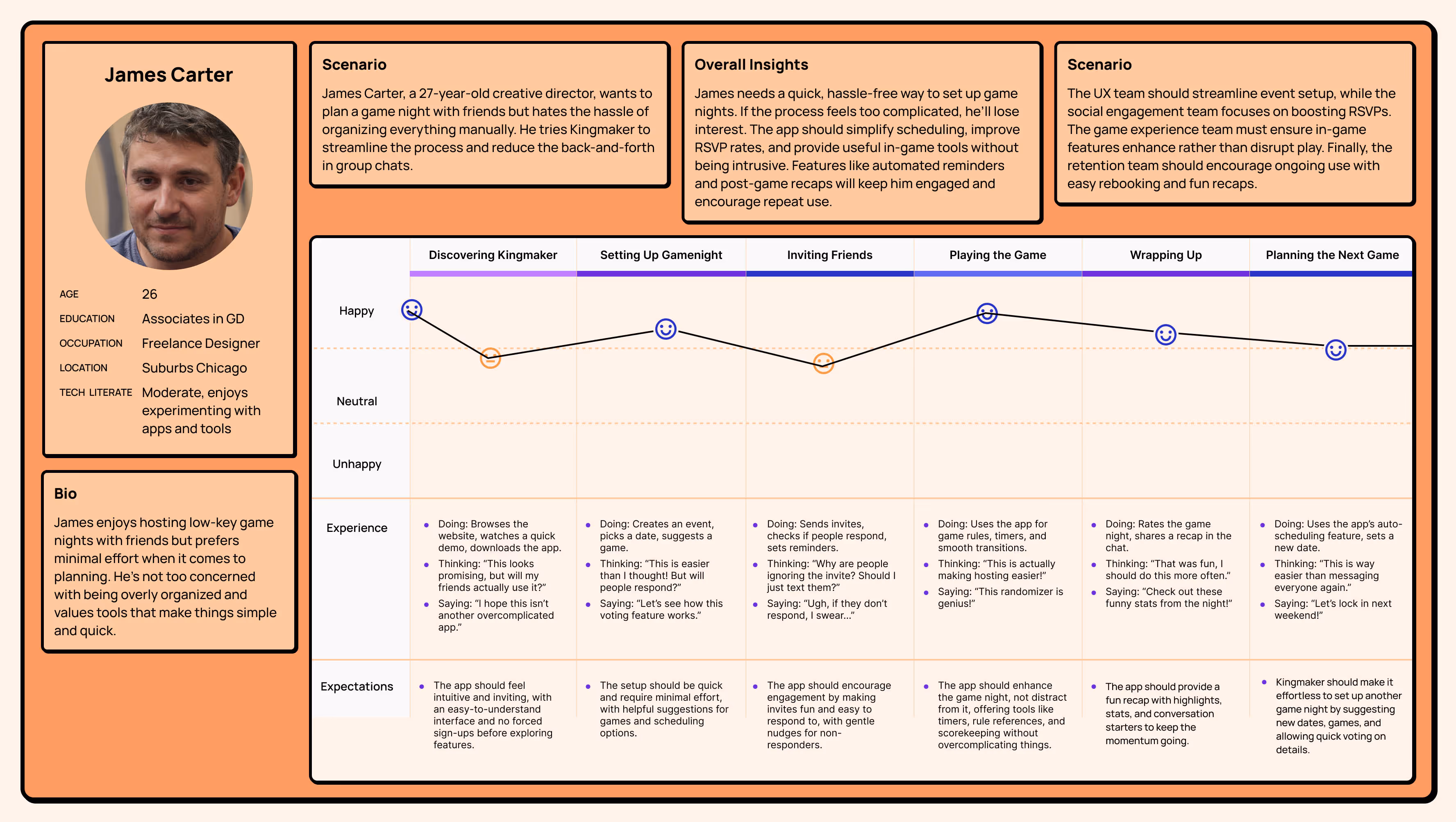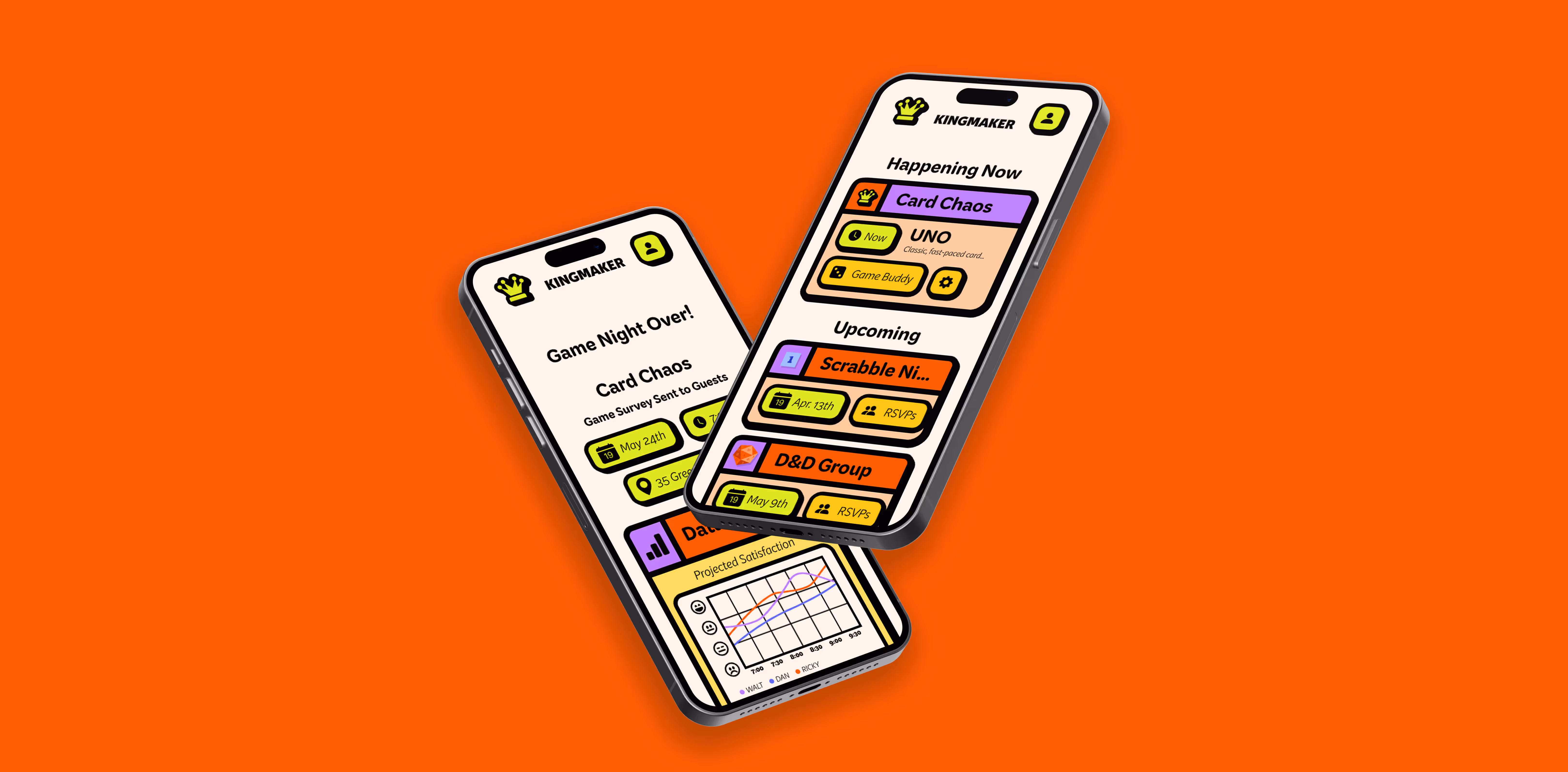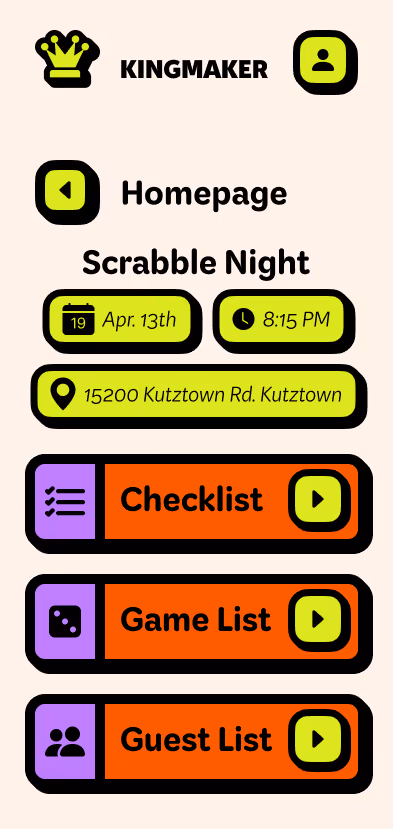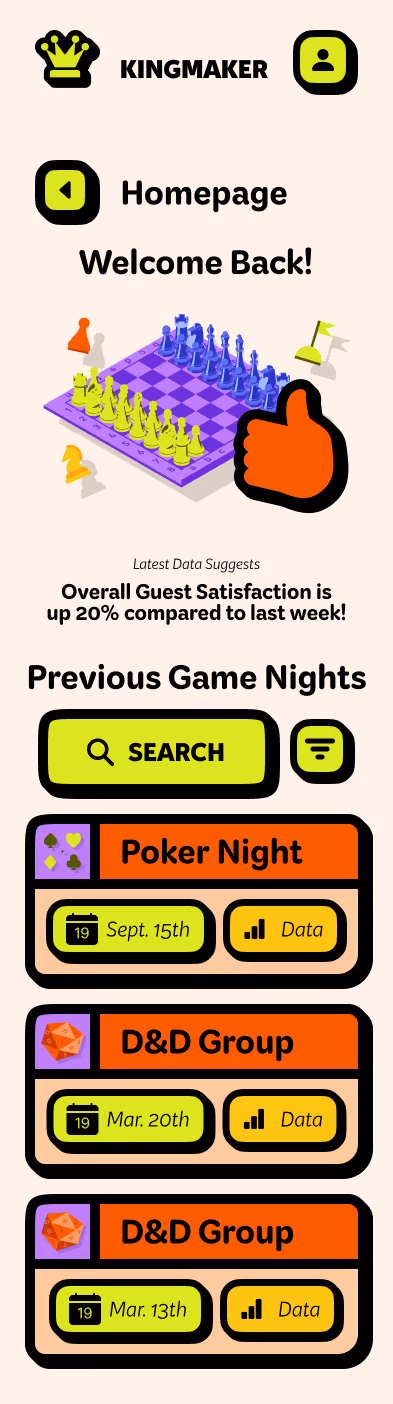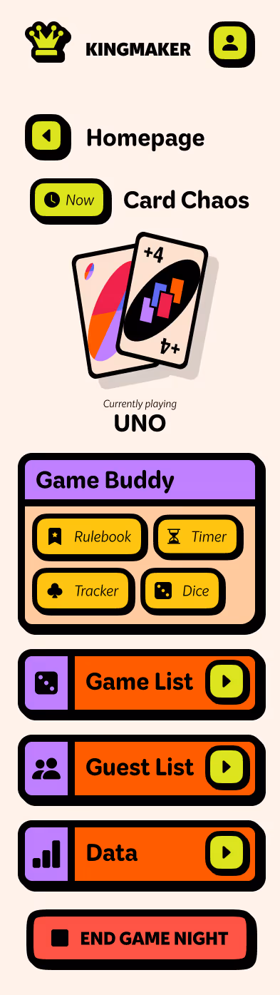 Kingmaker is a UX-driven event-planning platform that simplifies social gatherings and game nights for busy adults. The desktop app allows users to schedule events, invite friends, and track preferences to improve future experiences through adaptive suggestions and data-driven insights. Early development emphasized research, journey mapping, and wireframing to define user priorities before visual design began. A supporting mobile companion was created to maintain consistency and extend usability beyond the desktop interface. Kingmaker ultimately redefines digital planning as something social, simple, and human—encouraging connection through play rather than logistics.