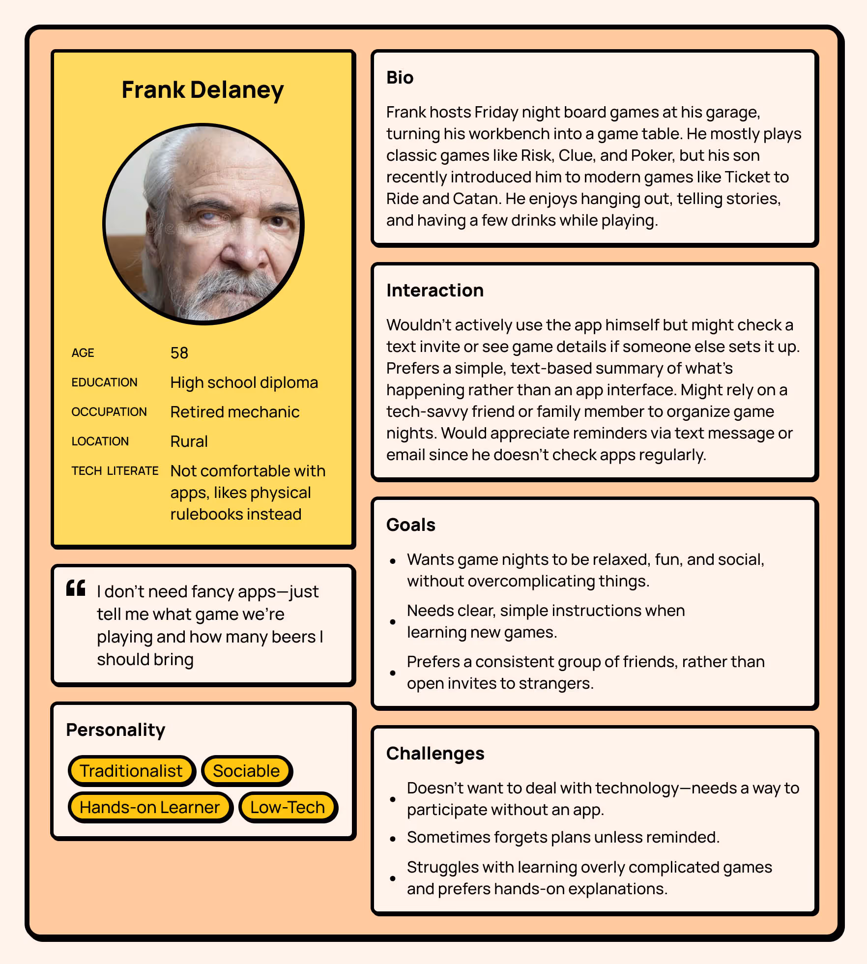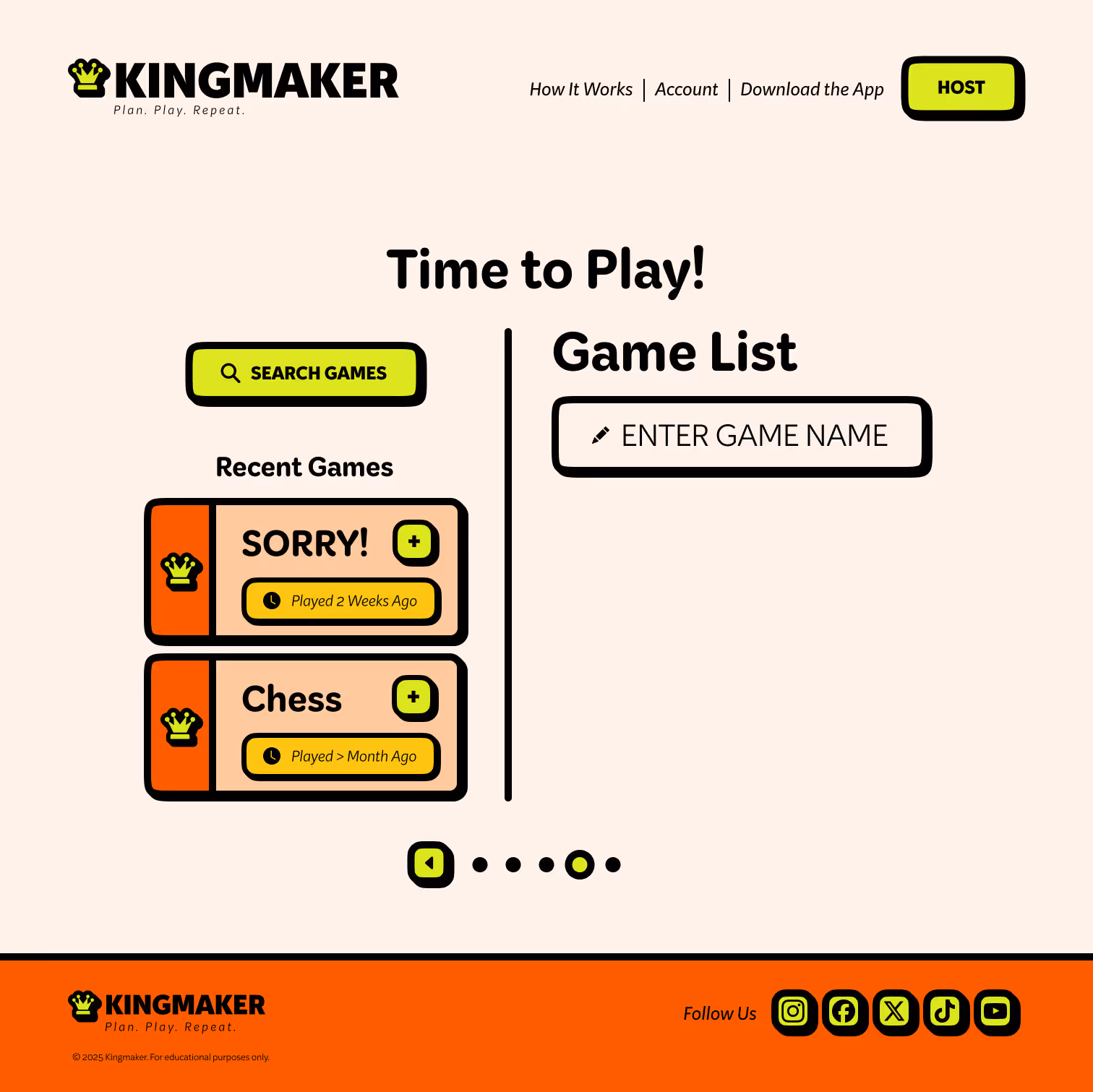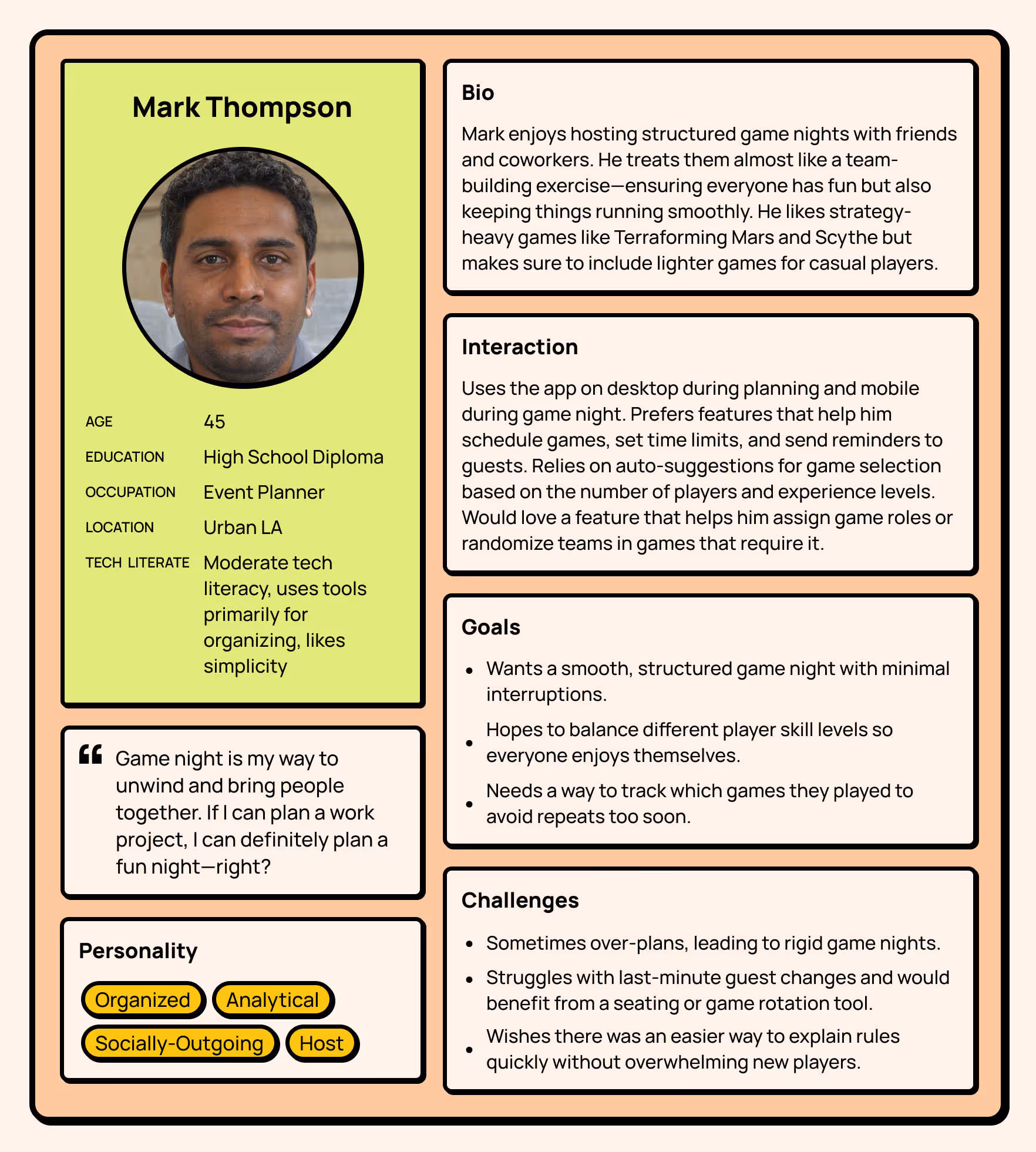Kingmaker is a UX-driven event-planning platform that simplifies social gatherings and game nights for busy adults. The desktop app allows users to schedule events, invite friends, and track preferences to improve future experiences through adaptive suggestions and data-driven insights. Early development emphasized research, journey mapping, and wireframing to define user priorities before visual design began. A supporting mobile companion was created to maintain consistency and extend usability beyond the desktop interface. Kingmaker ultimately redefines digital planning as something social, simple, and human—encouraging connection through play rather than logistics.