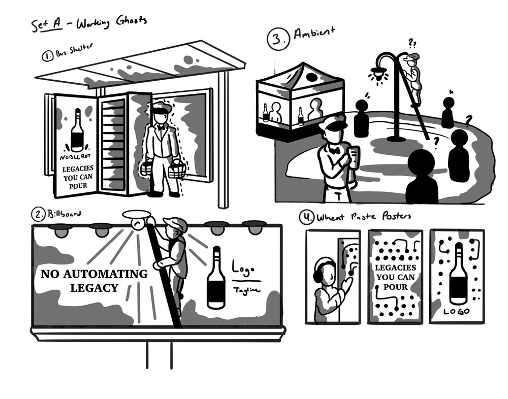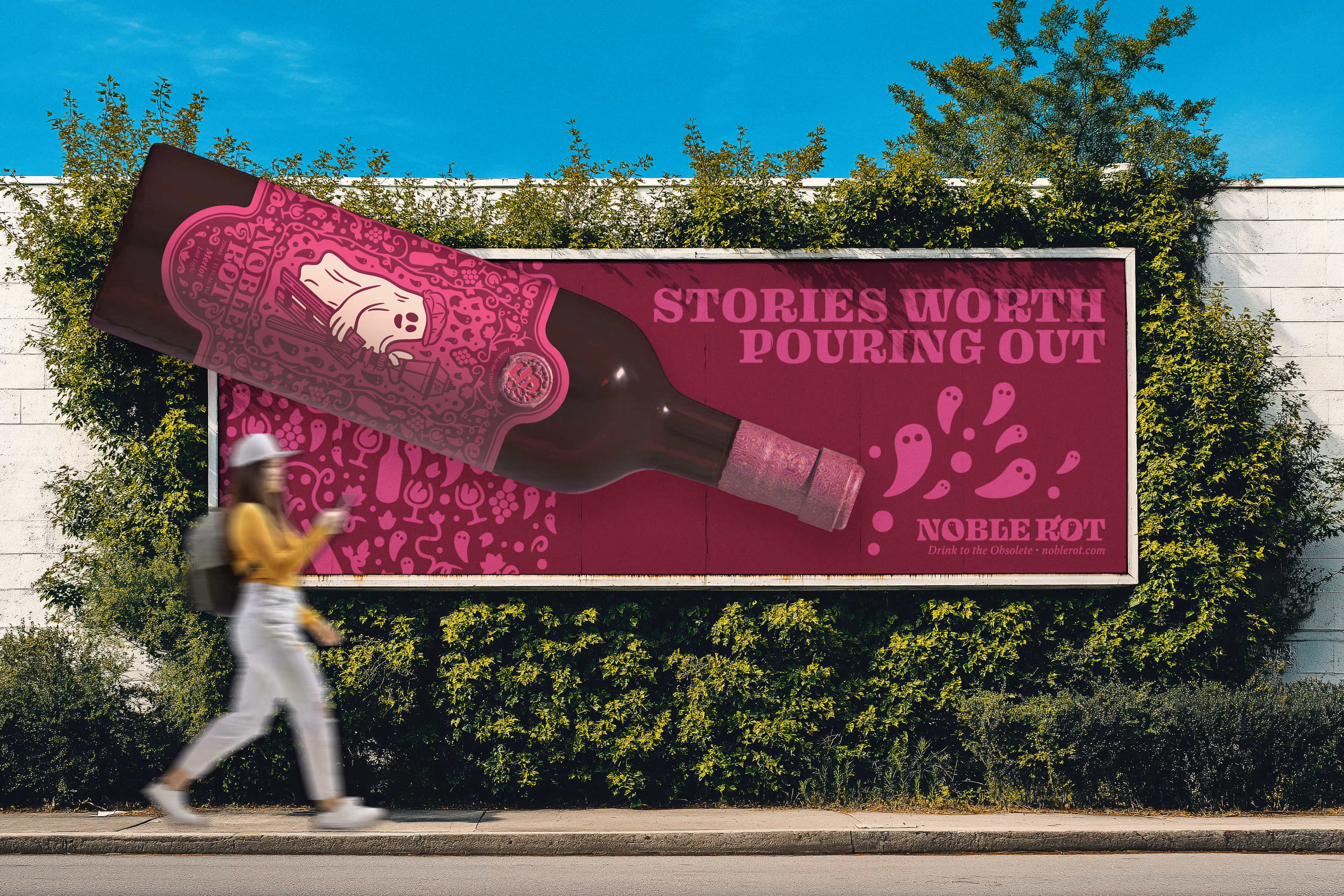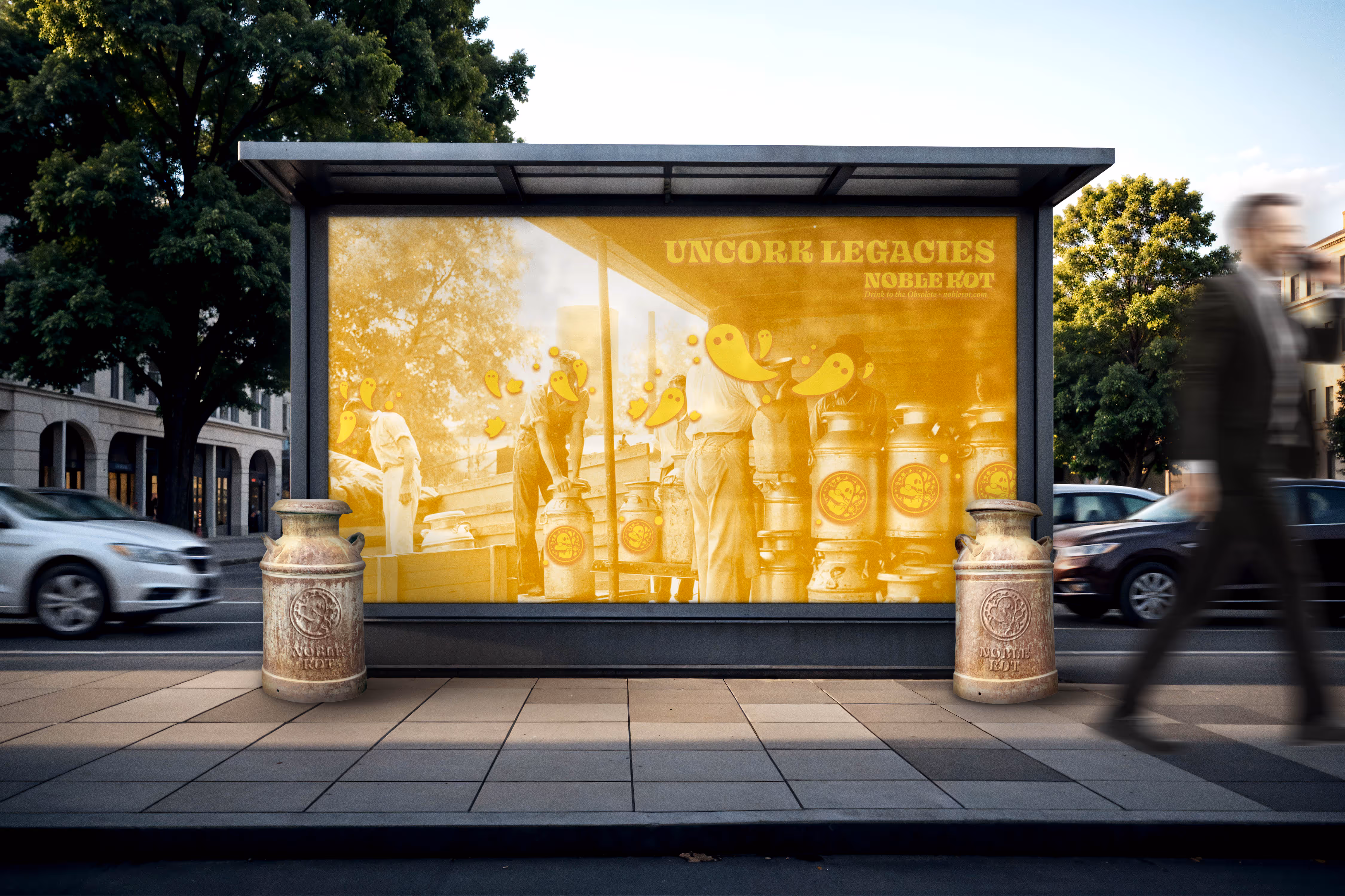 Noble Rot is a luxury wine brand celebrating the artistry of forgotten professions, transforming the idea of obsolescence into timeless craftsmanship. The creative direction centered on visual harmony, ensuring that every element—from color palettes to bottle patterns—reflected the identity of each trade. A cohesive system extended through packaging, advertising, and an AR tasting concept that brought the brand’s storytelling to life interactively. Promotional materials, such as wheat-paste posters and ambient events, further grounded the brand in a tactile sense of history. The result is a refined yet expressive identity that invites audiences to savor both heritage and design in every pour.